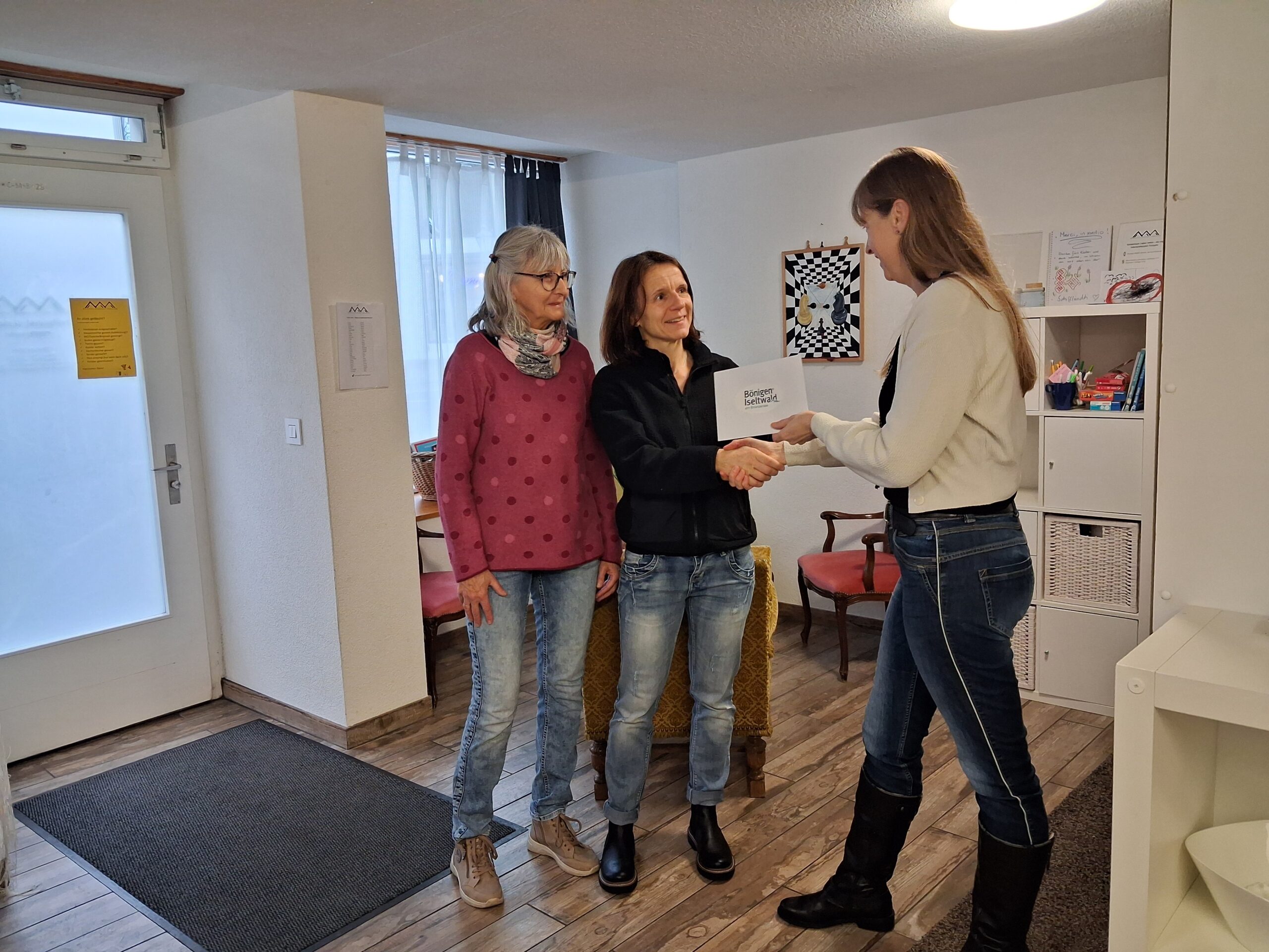 Es ist viel los im «in medio», als Titia Weiland am 12. Januar 2026 die Spende persönlich vorbeibringt. Im Hintergrund köchelt das Chili con Carne, denn seit Januar 2026 ist das «in medio» auch montags geöffnet und die MitarbeiterInnen erwarten in wenigen Minuten die ersten Gäste. Elisabeth Löffler, Vorstandsmitglied, erläutert Titia Weiland unsere Arbeit, die Herausforderungen, vor allem aber die Freuden, welche diese Arbeit trotz allem – oder gerade deswegen – mit sich bringt. Denn es sind immer andere Menschen, die Dinge auf sich nehmen, von denen wir lernen können. Wenn sie an dieser Stelle in zwei Worten zusammengefasst werden müssten, dann sind es diese: Dankbarkeit und Demut. Und so geben wir den Dank weiter. Zum einen an Bönigen-Iseltwald Tourismus für die grosszügige Spende, aber auch an unsere lieben Mitmenschen, denen wir Woche für Woche begegnen dürfen und die unsere Herzen berühren.